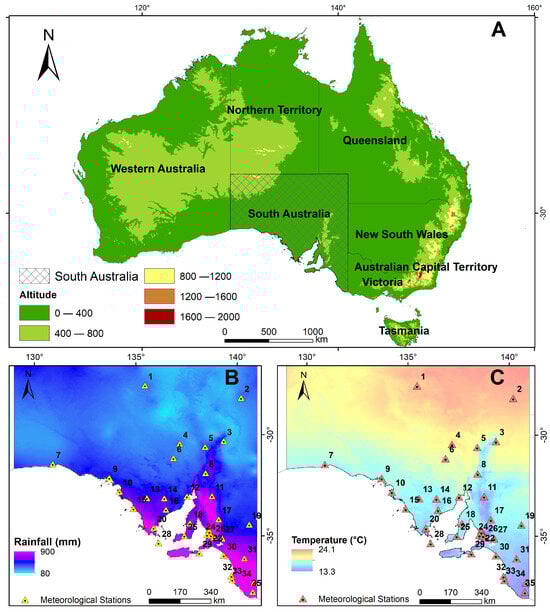 Maximum and minimum temperatures, standard deviation, and annual precipitation were calculated from 37 weather stations in SA (Table 1). The meteorological information was obtained for different periods but standardised between 1970 and 2021. The data were downloaded from the Bureau of Meteorology of the Australian Government (http://www.bom.gov.au/ (accessed on 30 December 2023).