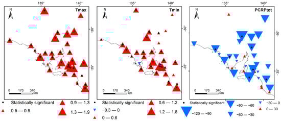 The maximum temperature has increased throughout the entire weather station suite analysed in SA, with most of the area experiencing significant changes (100% of the weather stations), showing a generally increasing trend. The minimum temperature in the majority of SA (86% of weather stations) has demonstrated a positive trend, with the exception of Cape Jaffa, which displayed a negative tendency. However, it is important to note that this change exhibited a non-significant trend, with the slope indicating negligible climatic change over time (−0.2 °C/period, p = 0.88). The annual precipitation during wet days has decreased (78% of weather stations), but positive trends have been identified in the coastal zones (+22 mm/period, p = 0.83) and in the north of the study area (Figure 2).