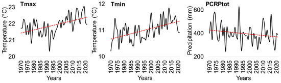 Regional behaviour of maximum temperature (Tmax), minimum temperature (Tmin), and the annual total wet-days precipitation (PCRPtot) for the period 1970–2021. The red dot-dash line indicates the slope for the study period.