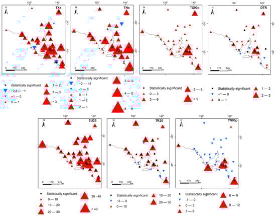 Trends and significance of the extreme hot events. Results for hottest days (TXx), the maximum monthly value of the daily minimum temp (TNx), warm nights (TX90p), DTR, summer days (SU25), tropical nights (TR20), and warm days (TN90p) are shown. The triangles indicate positive trends (in red) and negative trends (in blue), along with their intensity. The black dots indicate the statistical significance of the slope.