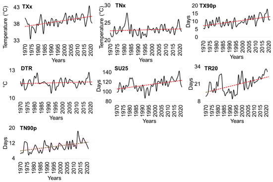 The output files were then carefully checked to prevent potential processing errors. Then, we conducted quality control and homogeneity assessments using the RClimDex Software [] and RHTest V4 Software, both of which were created by the Expert Team on Climate Change Detection and Indices (ETCCDI) and are freely available. RHTest V4 uses a penalised maximal t-test and a maximal F-test set in a recursive algorithm, which allows for temporal homogeneity analysis of daily data from the 37 weather sites [,,]. The objective of climatic homogenisation was to rectify observations by accounting for the fact that alterations in the corrected data were solely due to climate-related variations. Factors not related to climate included shifts in station placement, environmental changes, and alterations in instrumentation, all of which could potentially influence the authentic trends in the data []. Due to these factors, we were able to obtain missing data and outliers. It is worth noting that some stations had periods with missing information. Therefore, we extended the study period to 1970–2021 to establish statistical significance in this research.