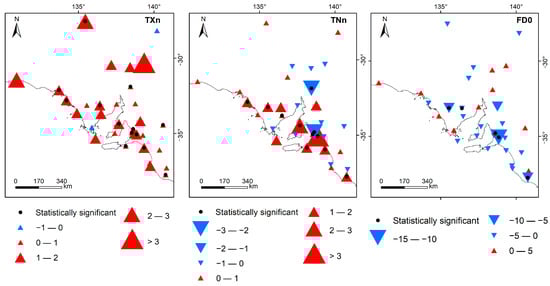 The spatial distribution of extreme cold events is presented in Figure 6. Coolest Days (TXn) shows an increase of up to 3 °C per period in the north, northeast, and west of SA. However, statistical significance was only identified in 35% of the area. The TNn shows a heterogeneous pattern, with values oscillating between −3 °C and 3.4 °C per period. Frost days (FD0) show a general decrease in most of the study area (68% of the weather stations). Consistent with extreme hot events, cold events also indicate global warming signals by increasing the minimum value of the maximum temperature and reducing frost days (Figure 6).