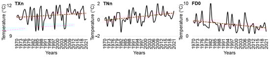 Regional behaviour of the Cold Extremes. Results for the monthly minimum value of the daily maximum temperature (TXn), the monthly minimum value of the daily maximum temperature (TNn), and frost days (FDO) are shown. The red dot-dash line indicates the slope for the study period.