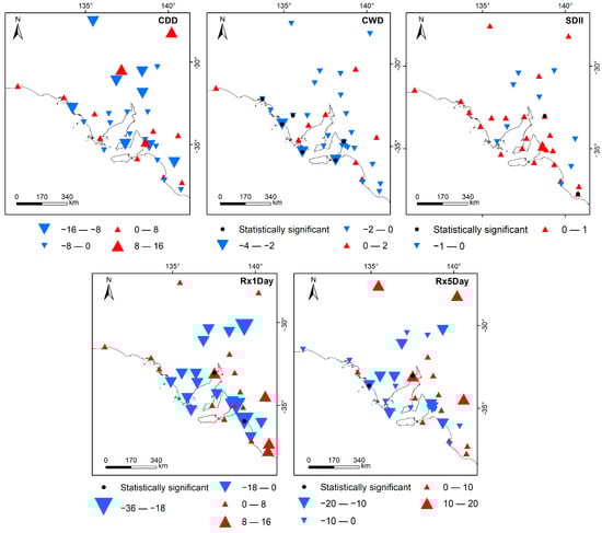 Extreme precipitation events may lead to an increase in the intensity and frequency of flooding, which can impose substantial costs on aquatic and terrestrial ecosystems, human societies, and the economy. Changes in flood characteristics not only depend on the spatial distribution, time evolution, and rarity of precipitation but also on antecedent soil moisture conditions [,]. In our study, we identified a decrease in the annual total wet-day precipitation across the entire area. However, despite the overall decrease in precipitation during the study period, extreme rainfall events increased in the central-eastern and coastal regions of South Australia. According to [], precipitation extremes may change differently from total precipitation. The simplest expectation is that precipitation extremes should scale with low-level atmospheric moisture content, which increases at a rate of about 6–7% K−1 warming, as predicted by the Clausius–Clapeyron relationship []. Therefore, global warming and anthropogenic aerosols are considered major components affecting extreme precipitation changes, e.g., [,].