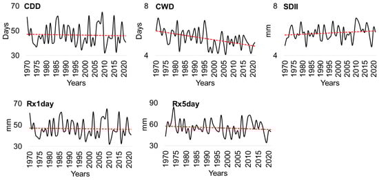 The data that supports this study will be shared, upon reasonable request, with the corresponding author. The information is available in the following links: http://www.bom.gov.au/https://etccdi.pacificclimate.org/list_27_indices.shtml (accessed on 30 December 2023).