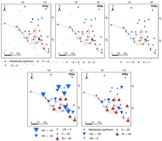 Precipitation daily events. R10p, R20p, and R30p indicate the annual count of days when the annual total wet-day precipitation PRCP > 10 mm, >20 mm, or >30 mm, respectively, and R95p and R99p indicate the annual total PRCP when RR > 95th and > 99th percentile respectively. The triangles indicate positive trends (in red) and negative trends (in blue), along with their intensity. The black dots indicate the statistical significance of the slope.