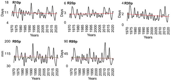 Precipitation and wet days demonstrated a heterogeneous pattern. Heavy rainfall increased in coastal areas by more than 5 mm during 1970–2021 but decreased in the continental region. Extremely heavy storms (R20p) are generally reduced in the region, except for the coastal zone in the central north and central east. Very heavy precipitation (R30p) had a similar pattern to R20p, but they demonstrated increased extreme precipitation events. Despite this, the changes observed in the study period are not climatically significant (Figure 10). Wet days (R95p) showed critical changes. They reduced from 20 to 60 days per period in the north and by more than 20 days per period in the south and coastal areas. Very wet days (R99p) showed similar behaviour, but the increase was less (3.2 days per period; Figure 10). The trend analyses for the 50-year study period demonstrated that heavy precipitation increased by 0.3 mm. The rest of the indices showed a negative trend in the region but with slight variations (Figure 11).