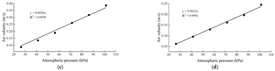 - There is a favorable linear relationship between atmospheric pressure and the airflow velocity of the ventilation hole. With a decrease in atmospheric pressure, the airflow velocity and ventilation volume through the hole decreased. For every 15 kPa decrease in atmospheric pressure, the air velocity decreased by an average of 24.6%. Additionally, with the decrease in atmospheric pressure, the subpressure in the cavity significantly decreased, and there was a trend of increasing cavity length.