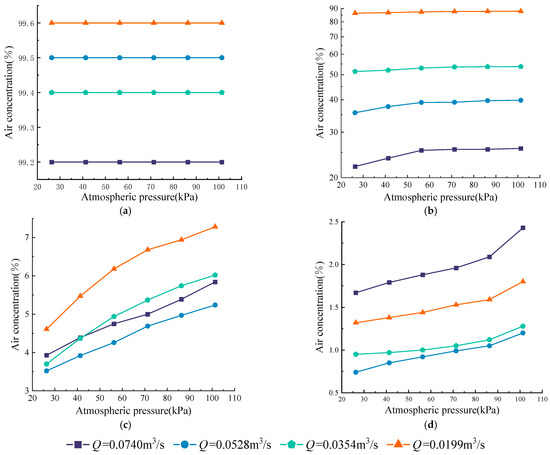 - When the atmospheric pressure decreased from 101.3 kPa to 26.3 kPa, the maximum reduction in air concentration in the cavity backwater area was 14.9%. The minimum reduction in air concentration at the end of the cavity was 32.7%, and the maximum reduction could reach 38.5%. The minimum reduction in air concentration in the bubble escape section downstream of the cavity was 25.8%, and the maximum reduction could reach 38.3%. As the atmospheric pressure decreased, there was a trend of decreasing air concentration in the water, and the extent of this decrease depended on the initial air concentration. When the water air concentration was higher, the reduction was initially small, followed by a more significant decrease. Conversely, when the water air concentration was lower, the reduction showed an initially larger decrease followed by a smaller decrease.