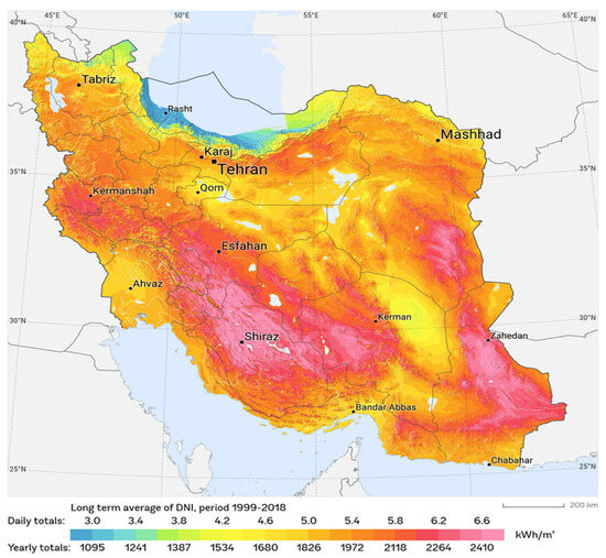 With an area of 1,648,000 km2 and a population of more than 80 million in 2017, Iran is the seventeenth biggest country in the world and is located in the western region of Asia [59,60]. Agricultural land makes up nearly 11.2% of the country’s total land area, while 8.7% is forested, 19.7% is arid land, and 7.3% is industrial/residential. In recent years, the nation has seen a decline in precipitation and is faced with drought and shortages of water [61]. The climate in Iran is predominantly arid and semi-arid, with the exception of the mountainous regions in the northern and western parts of the entire country. In addition, apart from the coastal regions, the temperature in Iran exhibits a substantial annual variation, ranging from approximately 22 °C to 26 °C. The majority of Iran experiences the influence of subtropical high air masses throughout the summer season. These result in the occurrence of scorching summers in the country, while precipitation reduces to 100 mm or less in the central and eastern regions of Iran. Iran has a favorable geographical location for receiving solar energy. The sun irradiation in Iran is predicted to be around 1800 to 2200 kWh/m2 per year, which exceeds the global average. Iran has a high average annual number of over 280 sunny days, which covers over ninety percent of its territory and represents a significant and lucrative energy resource [62].