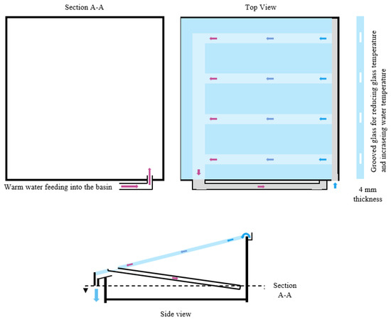 The main drawbacks of conventional solar still systems are the high required energy for heating the water, the elevated temperature of the glass during the working time, and the limited working time. As shown in Figure 3, in order to overcome the high temperature of the glass, a new water pathway for the solar still system was used in this research. In the proposed new system, the water entrance pathway was changed, and after passing through the grooves of the top glass, the heated water feeds into the basin.