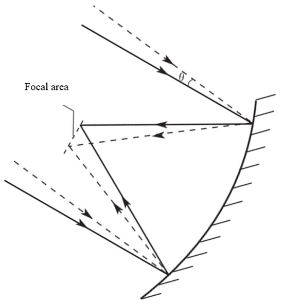 Since we are trying to propose a passive system that reflects solar radiation to the distillation system throughout the year without the need to apply direction changes or a solar radiation tracking system, the important point is to adjust the angle of the reflector in such a way that there is no need to change the angle of the reflector throughout the year and this system can reflect solar radiation to the solar still. This can be achieved by using the concept of a focal plane instead of the focal point of the reflector.