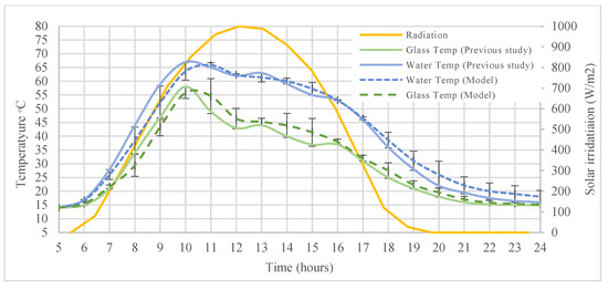 In order to ensure the applicability and reliability of the results, validation of the utilized mathematical models is of great importance. In this regard, the mathematical equations and input data, such as ambient temperature, radiation intensity, and area of the solar still, from previous research published by [74] were utilized to validate the calculation process. As Figure 7 shows, our calculations are accurate enough that the modeling, calculation, facilitating assumptions, and outcome results are considered correct.