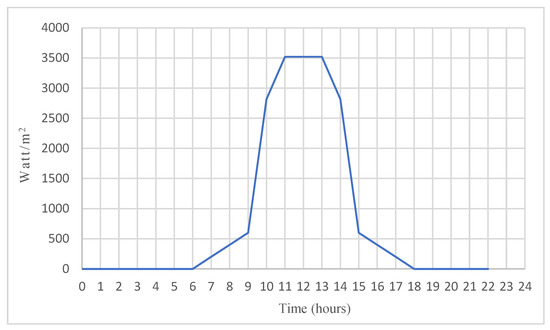 In order to make the calculations simpler, instead of using the exact radiation values, we assumed that the hourly solar radiation distribution is geometrical. Therefore, as shown in Figure 4, we assumed that the daylight period is 12 h of radiation, and its distribution is linear. Although this assumption is not accurate, it is not far from the actual irradiation of the south of Iran. Based on the below calculation and Figure 4, it can be seen that approximately 0.55% of solar radiation is in the middle 4 h of the day, which justifies the 4 h period that we considered in this research. And the highest amount of water production is in the same hourly range.