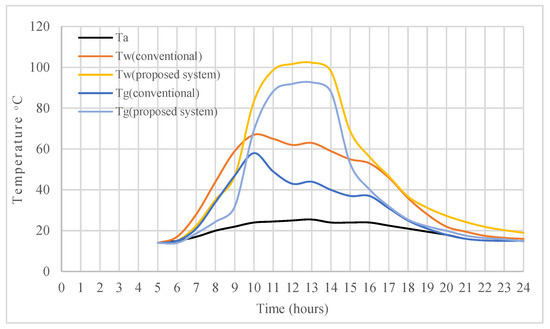 The results presented are for a clear and sunny day despite the fact that solar intensity can vary from what we consider during a year. We consider a comparison between the proposed method and a conventional solar still calculated for summer, in which the solar radiation is high. As is presented in Figure 8, the maximum solar radiation was about 3520 W/m2 and 2816 W/m2 at noon and two hours before and after that, respectively. Figure 9 depicts the variation in temperature in the conventional and proposed systems. It is widely recognized that the disparity between the water and the glass cover inlet gives rise to an augmentation in the heat transfer through natural convection within the confines of the desalination system. The average difference between Tw and Tg in the conventional system was 6 °C. The highest Tg and Tw values were obtained at 1 p.m., about 58 °C and 67 °C, respectively, which led to a 34 °C temperature differential between the glass and the ambient temperature. The temperature fluctuation of the suggested system is also depicted in Figure 9. The patterns exhibited similarities to conventional ones, albeit with significantly greater values, primarily attributed to the integration of a solar collector. Throughout the testing, the average temperatures of the basin, water, and glass cover were recorded as 48, 39 and 29 °C, respectively. The water production of solar desalination increased by widening the temperature difference between the temperature of the water (Tw) and the temperature of the condenser (Tg). The glass cover reached a maximum temperature of 88 °C at 2 p.m., while the water vapor reached a maximum temperature of 98 °C at the same time.