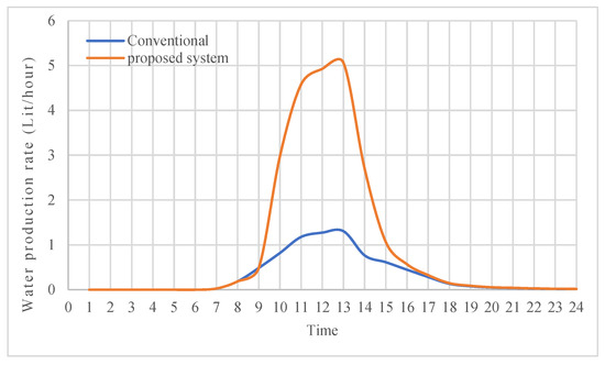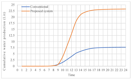 Figure 10 illustrates the hourly fluctuation in freshwater production by both the traditional and proposed systems. The water generation trend is similar at different hours in both cases. The maximum hourly production, as determined, was 1.3 L/m2 and 5.06 L/m2, respectively, achieved at 1 p.m. The results demonstrated that the daily distillate production of the traditional and proposed methods was 23.29 L/m2 and 7.73 L/m2, respectively. The production increased by 301% compared to that of passive ones. The creation of water persisted in the evening after 6 p.m. even under low solar radiation in both. Furthermore, the amount of energy produced during the night in an active system was greater than in a passive system as a result of higher water and basin temperatures. The use of a solar collector increased the system’s absorption area and enhanced the water temperature in the solar still system.