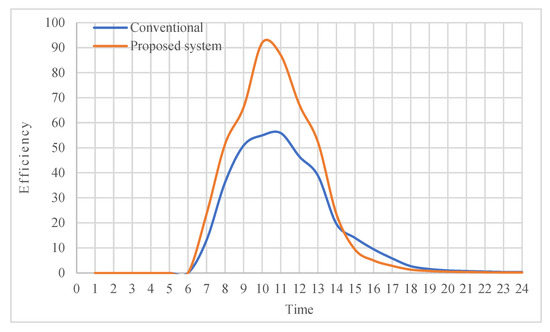 Figure 11 displays the hourly energy efficiency of the systems. The efficiency of the solar still paired with a solar collector was higher than that of a traditional system due to the increased absorption area of the device. It was noted that the suggested system exhibited higher energy efficiency compared to conventional methods during different hours of testing. This was attributed to the utilization of a solar reflector. The conventional mechanism achieved a maximum hourly energy efficiency of 67.9%, whereas the proposed system achieved a maximum hourly energy efficiency of 78.2%. The daily energy efficiency for the systems was 25.6% and 32.6%, respectively.