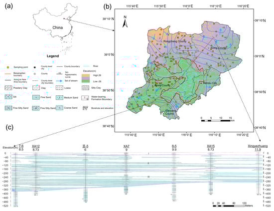 Location of the study area (a) within China (No. GS (2019) 1822), (b) sampling sites in the Xiong’an New Area, and (c) representative hydrogeological profile.