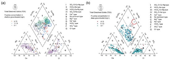 Piper plots of SG and DG samples. (a) The hydrochemical types of SG samples. (b) The hydrochemical types of DG samples.