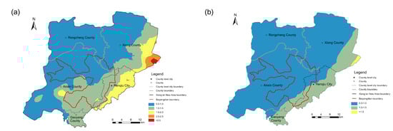 Spatial distribution of F− in groundwater at the Xiong’an New Area. (a) The spatial distribution of F− in SG. (b) The spatial distribution of F− in DG.