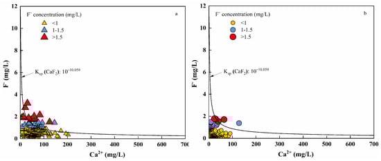 There is no doubt that F-bearing minerals dissolution is the principle geochemical process for F− release. As shown in Table 1, Table S1 and S2, whether for the SG or DG samples, the saturation index (SI) of fluorite consistently remained below 0. Meanwhile, most low- and moderate-F− SG samples, and almost all DG samples were under the fluorite dissolution line (Figure 4a,b). A significant positive correlation between F− concentration and SIfluorite was shown in SG and DG samples (Figures S5 and S6). All of these results indicate that the hydrolysis of fluorite is the predominant controlling factor for F− enrichment in the study area. Noting that, the majority of high-F− SG samples were above the fluorite dissolution line (Figure 4a), illustrating that the genesis of high-F− groundwater was complex in the shallow aquifers.