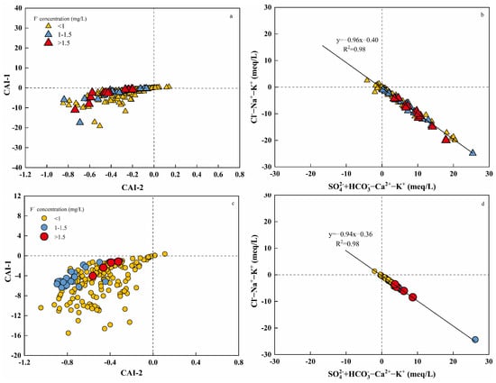 Furthermore, to investigate the impacts of cation exchange processes, we employed linear relationships between HCO3−+SO42−-Ca2+-Mg2+ and Cl−-Na+-K+ [], as well as Schoeller’s chloride–alkalinity indices (CAI-1 and CAI-2) to assess the influence of cation exchange on the formation of high-F− groundwater []. Specifically, a slope closer to −1 in the linear fitting between HCO3−+SO42−-Ca2+-Mg2+ and Cl−-Na+-K+ indicates a more significant impact of cation exchange on ion composition of groundwater.