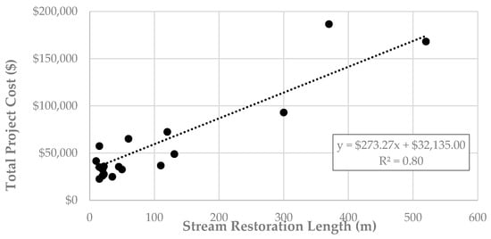Figure 2 shows a linear trend between the stream restoration length and total project cost, with an initial cost of about $32,000 (to cover the equipment, design, permitting, and mobilization) and about $274 per meter length of the stream restoration project. Data for Figure 2 were collected by the Lake Simcoe Region Conservation Authority (LSRCA) and provided to the authors for use in this study. These data include records of total costs to complete stream restoration projects in the Holland River watershed (which is within the Lake Simcoe Region Conservation Authority Jurisdiction).