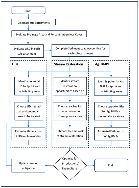 A cost–benefit analysis focused on P load reduction was completed for Tannery Creek considering the above mitigation measures. The objective of the cost–benefit analysis was to explore each mitigation measure’s relative costs and benefits. The watershed-scale approach of this study will help to quantify the required funding to obtain the desired level of P load reduction. The results are specific to Tannery Creek and typical support funding mechanisms in place in 2023 but demonstrate a method that could be applied to mitigation planning in other study areas. The approach to mitigation and cost optimization is illustrated in Figure 3 and discussed further in Section 3.4, Section 3.5, Section 3.6, Section 3.7 and Section 3.8.