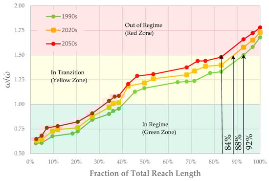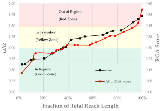 A comparison between the length of the out-of-regime channel, identified in the current study using stream power (ω/ω’), and the rapid geomorphic assessment (RGA score) study conducted by the Aquafor Beech Ltd. [32] classifications is shown in Figure 4, that shows a good agreement between the two methods. Based on this finding, the ω/ω’ criteria (<1 in regime; between 1 and 1.5 in transition; and >1.5 out-of-regime) may be used to assess regime conditions from topographic surveys and discharge records for short reaches of stream channels.