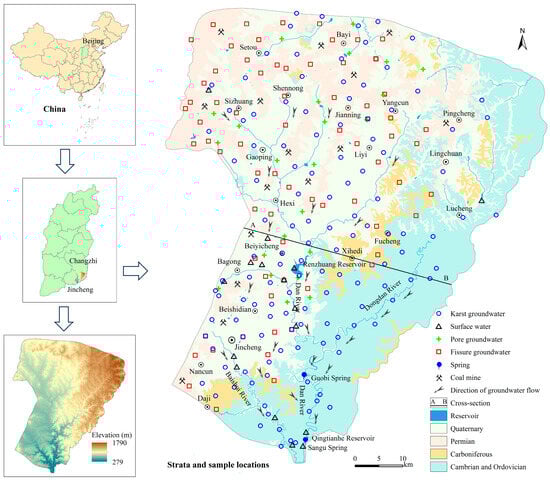 - Liu, X.H.; Zhang, Y.B. Groundwater resources evaluation on Sangu spring region of Jincheng of Shanxi Province. J. Taiyuan Univ. Sci. Technol. 2009, 30, 261–263, (In Chinese with English abstract). [Google Scholar]