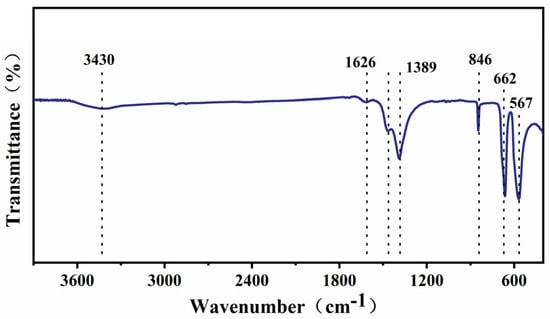Characterization of the Co3O4@BiOI composite by FTIR generated the spectra presented in Figure 3. Characteristic absorption peaks at 5,671,375 and 1626 cm−1 are observed in BiOI []. In addition, peaks at 662 and 579 cm−1 are attributed to Co-O bond stretching in the Co2+-coordinated tetrahedron and the Co-O bond in the Co3+-coordinated octahedron, respectively [].