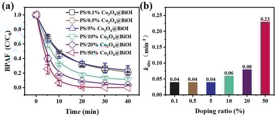 The effect of different levels of Co3O4 doping (0.1% Co3O4@BiOI, 0.5% Co3O4@BiOI, 5% Co3O4@BiOI, 10% Co3O4@BiOI, 20% Co3O4@BiOI, and 50% Co3O4@BiOI) on the catalytic activity was assessed. As shown in Figure 4, Co3O4 doping had a significant influence on the BPAF removal rate, with the highest activity delivered by 50% Co3O4@BiOI, where the BPAF in water was almost completely removed within 30 min. The 50% Co3O4@BiOI composite was accordingly selected for subsequent testing.