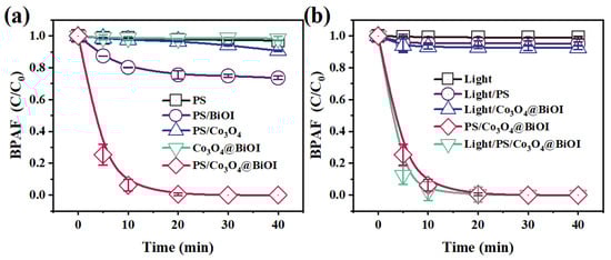 In this study, blank control systems (PS, BiOI/PS, Co3O4/PS, Co3O4@BiOI, and Co3O4@BiOI/PS) were employed to assess the catalytic performance of Co3O4@BiOI. As shown in Figure 5, minor changes were observed in the BPAF removal rate from the aqueous solution with the addition of PS or Co3O4@BiOI alone. The removal rate by Co3O4@BiOI/PS was markedly higher than that recorded for BiOI/PS (26.4%) and Co3O4/PS (9.3%) under the same conditions. The results have established that the Co3O4@BiOI composite prepared by adding Co3O4-modified BiOI exhibited significantly higher activity than pure BiOI or Co3O4 before modification.
