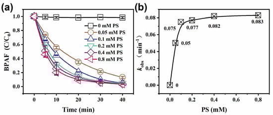 Effect of PS dosage on BPAF removal in the Co3O4@BiOI/PS system. (a) BPAF removal; (b) kobs of BPAF.