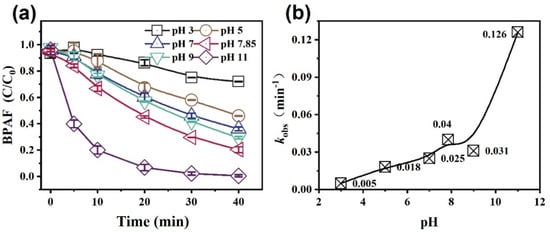 Effect of the solution pH on BPAF removal in the Co3O4@BiOI/PS system. (a) BPAF removal; (b) kobs of BPAF (experimental conditions: [Co3O4@BiOI]0 = 150 mg/L, [PS]0 = 0.1 mM, [BPAF]0 = 5 mg/L, initial pH = 3.0~11.0, T = 25 ± 1 °C, reaction time: 40 min).