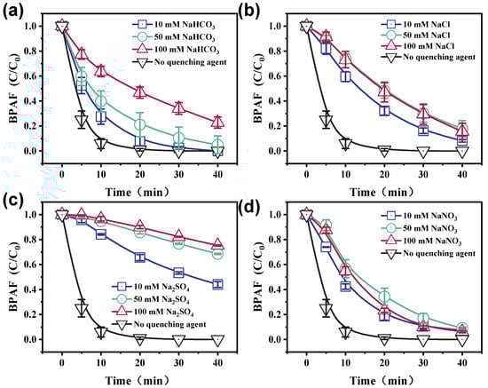 Effects of anions at different concentrations on BPAF removal in the Co3O4@BiOI/PS system. (a) HCO3−, (b) Cl−, (c) SO42−, (d) NO3−. (Experimental conditions: [Co3O4@BiOI]0 = 150 mg/L, [PS]0 = 0.1 mM, [BPAF]0 = 5 mg/L, initial pH = 3.0~11.0, T = 25 ± 1 °C, reaction time: 40 min).