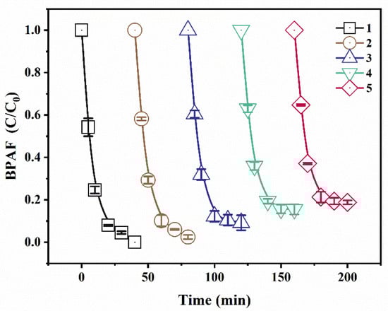 Bisphenol A (BPA) is widely used in the synthesis of plastics and resins. However, BPA has been identified as an endocrine-disrupting chemical (EDC), which can severely impair the nervous, immune, and reproductive systems of organisms even at low doses []. As the use of BPA has been restricted in several countries, a number of chemicals with similar structures, such as bisphenol AF (BPAF), have been developed as replacements [,]. As a result of the large-scale production and widespread application in various industries, concentrations of BPAF up to 15.3 μg/L have been detected in rivers, groundwater, sewage, and landfill site leachate []. Reports have shown that BPAF exhibits a reproductive toxicity and endocrine-disrupting effect equivalent to or even greater than BPA []. Moreover, BPAF has a longer half-life and poorer biodegradability []. Various methods have been developed to treat BPAF in wastewater, including montmorillonite-mediated photodegradation [], ferrate oxidation [], periodate activation [], catalytic peroxymonosulfate (PMS) oxidation [], and chlorination []. These methods exhibit a number of shortcomings, such as high cost, complicated operation, and secondary pollution, which hinder practical application [,,]. Consequently, an efficient BPAF treatment and removal method is urgently required.