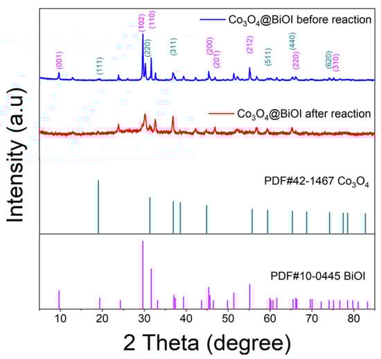 XRD patterns of the synthesized Co3O4@BiOI before and after reaction. (Experimental conditions: initial [Co3O4@BiOI]0 = 150 mg/L, [PS]0 = 0.1 mM, [BPAF]0 = 5 mg/L, initial pH = 7.85 ± 0.2, T = 25 ± 1 °C).