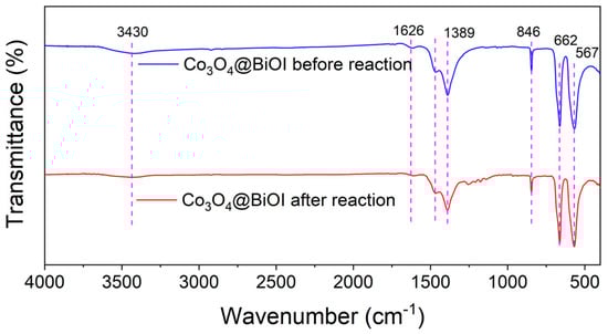 FT−IR patterns of the synthesized Co3O4@BiOI before and after reaction. (Experimental conditions: initial [Co3O4@BiOI]0 = 150 mg/L, [PS]0 = 0.1 mM, [BPAF]0 = 5 mg/L, initial pH = 7.85 ± 0.2, T = 25 ± 1 °C).