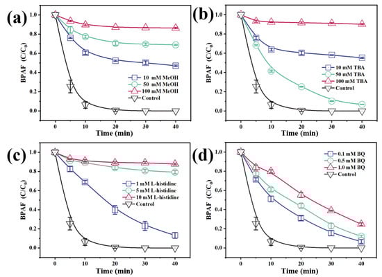 Quenching tests for different reactive oxygen species ([Co3O4@BiOI]0 = 150 mg/L, [PS]0 = 0.1 mM, [BPAF]0 = 5 mg/L, initial pH = 7.85 ± 0.2, T = 25 ± 1 °C). (a) MeOH; (b) TBA; (c) L-histidine; (d) BQ.