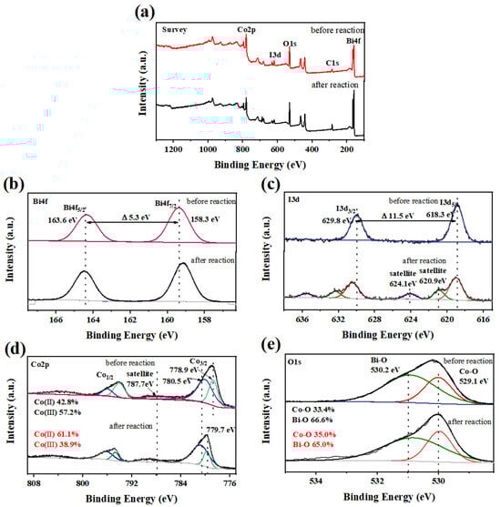 Possible changes to the surface chemistry of Co3O4@BiOI in activating PS were assessed by XPS analysis of the composite before and after the reaction (Figure 14). The XPS survey spectra revealed no variations in the major element species associated with Co3O4@BiOI before and after the reaction, identifying Bi, I, Co, O, and C as the major components. As shown in Figure 14b,c, there is no evident alteration in the spectra of Bi 4f and I 3d following the reaction. The XPS analysis has not detected a conversion between Bi(Ⅲ) and Bi(V) during the reaction. In contrast, the spectra of Co 2p before and after BPAF degradation establish a difference in the Co(II) and Co(III) composition (Figure 14d). The atomic composition of Co(II) and Co(III) was changed from 61.1% and 38.9% to 42.8% and 57.3% after the reaction. This response may be attributed to electron donation by Co(II), increasing the Co(III) content as part of the Co(II)-Co(III)-Co(II) cycle during the catalytic reaction []. The results suggest the interactive conversion of Co(II) to Co(III) in the Co3O4@BiOI that promotes PS activation. The spectra of O1s before and after the reaction are presented in Figure 14e and show an increase in the relative contribution of Co-O from 33.4% to 35.0% following the reaction. Moreover, the relative contribution of Bi-O fell from 66.6% to 65.0%, implying that the two types of oxygen were mutually transformed and participated in the oxidation process [,].