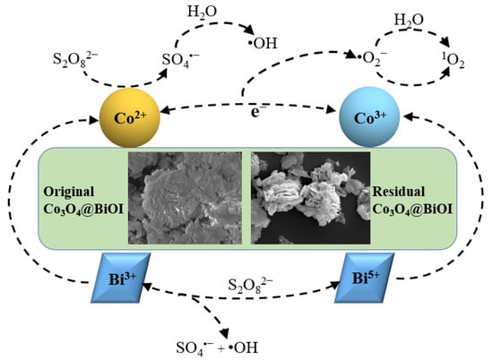 Based on the results of the quenching tests, EPR analysis, and structural changes determined by XPS, a reaction mechanism is proposed that accounts for the activation of PS by Co3O4@BiOI, outlined in Figure 15 and Equations (3)–(10). The combination of the lower-valence Co(II) with the dissociation and adsorption of water produced CoOH+ (Equation (3)) on the surface of Co3O4@BiOI and subsequently interacted with PS in solution through hydrogen bond formation [,,]. Co(II) immediately loses electrons and is oxidized to high-valence Co(III) []. O-H and O-O bonds break while accepting electrons to generate highly reactive SO4•− that reacts with water to produce •OH (Equations (4) and (5)) [,]. The CoO+ that is formed (Equation (4)) can react with PS to generate Co(II) and •O2− (Equation (6)). The transformation between Co(II) and Co(III) effectively promotes the catalytic activation of PS. Reports in the literature have shown that the redox couple (Bi(Ⅲ) and Bi(V)) in BiOI can also activate PS and produce free SO4•− and •OH (Equations (8)–(10)) [,]. We propose that Co(Ⅱ)/Co(Ⅲ) and Bi(Ⅲ)/Bi(V) serve as redox couples that participate in activating PS in the Co3O4@BiOI/PS system. The two components (Co3O4 and BiOI) from the Co3O4@BiOI exhibit a synergism that promotes the rapid oxidative degradation of BPAF in water. The XPS analysis has suggested a mutual conversion between lattice oxygen associated with Co-O and Bi-O on the composite surface that contributes to the oxidation process, where •O2− generated by CoO+ (Equation (6)) reacts with •OH in the solution to produce 1O2 (Equation (7)), accelerating BPAF removal []. In this process, •O2− mainly serves as an intermediate in a mass transfer step that promotes catalytic oxidation.