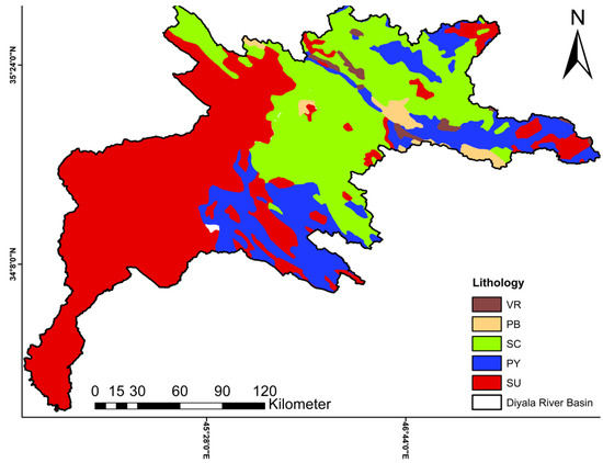 Lithology map of the Diyala River Basin. VR, basic volcanic rocks; PB, plutonic rocks; SC, carbonate sedimentary rocks; PY, pyroclastic; SU, unconsolidated sediments.