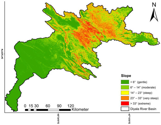 The gradient of the terrain plays a crucial role in determining local relief and its impact on groundwater recharge. This factor is commonly used in delineating GWPZ, as it directly influences the infiltration of surface water. The slope of the basin governs the energy of water flow and consequently influences the rate of both infiltration and runoff. Steep slopes allow for inadequate time for infiltration compared to gradual slopes, resulting in reduced groundwater recharge due to high runoff rates and vice versa [49]. The basin slope can be derived using the ArcGIS environment through the spatial analyst/surface/slope tool.