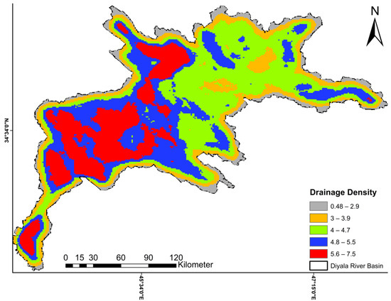 The DRB drainage density is represented by five classes: 0.48–2.9 km/km2, which makes up more than 6% of the studied region; 3–3.9 km/km2, which equates to roughly 15%; 4–4.7 km/km2, which covers more than 32%; 4.8–5.5 km/km2, which makes up more than 26%; and 5.6–7.5 km/km2, which represents more than 20.13%. Consequently, the maximum region of the basin has low to moderate drainage densities (Figure 6).