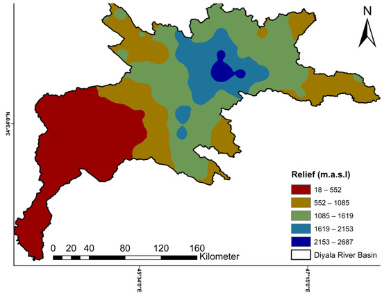 The Diyala River is the third stream of the Tigris River, Iraq; it originates near Sanandaj in the Zagros Peaks in Iran, establishing the Iran–Iraq boundary for over 30 km, with an entire length of about 574 km [14,15]. The Basin of Diyala River (DRB) lies between 33.216° and 35.833° N latitude, and between 44.500° and 46.833° E longitude, with a total area of nearly 32,752 km2 [8]. Approximately 75% of the basin resides in Iraq, and the remaining is located in Iran (Figure 1). The mean annual precipitation and air temperature are 420 mm and 36 °C, respectively. The flow system of DRB is highly seasonal, with a peak occurring in April and a low cyclical flow rate starting in July and ending in December. About 23% of the land in the basin is used for agriculture, leaving the remaining 77% of the catchment covered by forest [14,15].