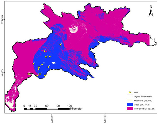 The Department of Water Resources in the province of Diyala provided the experimental data, as Table 7 [58] illustrates. Coordinates and discharge values for the wells are among the information. After identifying the GWPz, a validation between GWPz classes and well yield ranges were considered based on a classification given by Patle et al. [59] and the corresponding results are shown in Table 7. The results revealed that numbers and percentages of points (with concerning yield ranges) are correctly classified in all the zones of groundwater potential over the entire area.