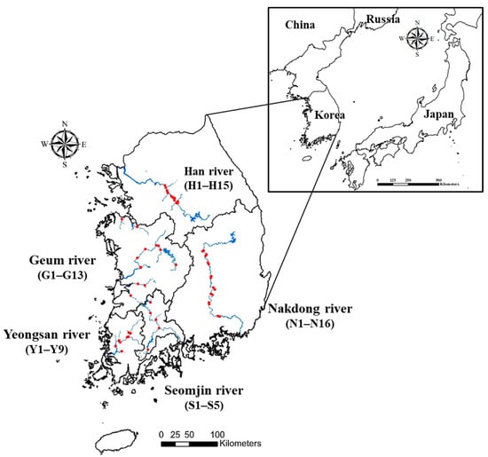 According to the water environment information system of the Ministry of Environment, Korea’s major watersheds are divided based on five major rivers: Han River (HR), Geum River (GR), Nakdong River (NR), Yeongsan River (YR), and Seomjin River (SR) (http://water.nier.go.kr) [33]. These rivers eventually flow to the western and southern coasts of Korea. The average annual precipitation of each watershed is 1360 mm, 1258 mm, 1337 mm, and 1392 mm for HR, GR, NR, and Y-SR, respectively, with the GR watershed receiving the least amount of precipitation [34]. The region is characterized by a monsoon climate with more than 70% of annual precipitation recorded in summer. The area of each watershed is HR 41,957 km2, NR 23,690 km2, GR 9912 km2, SR 4914 km2, and YR 3371 km2. In this study, the survey sites were categorized into HR, GR, NR, YR, and SR, and a total of 58 sites including 15 sites in HR (H1–H15), 13 sites in GR (G1–G13), 16 sites in NR (N1–N16), 9 sites in YR (Y1–Y9), and 5 sites in SR (S1–S5) were selected from the national sediment monitoring network operating in these watersheds (Figure 1).