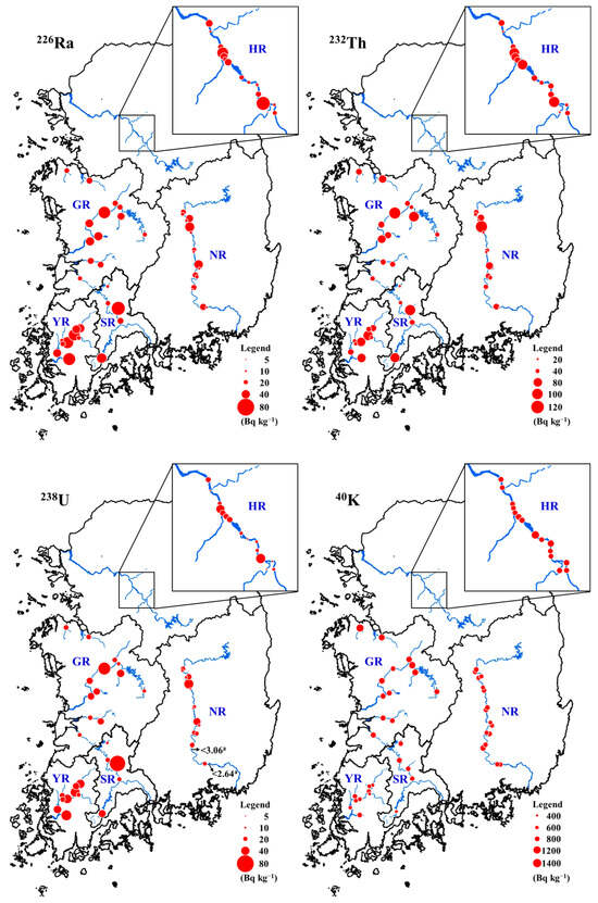 The spatial and frequency distributions of 226Ra, 232Th, 238U, and 40K radionuclides in the surface sediments collected from major river watersheds in Korea are shown in Figure 2 and Figure 3.