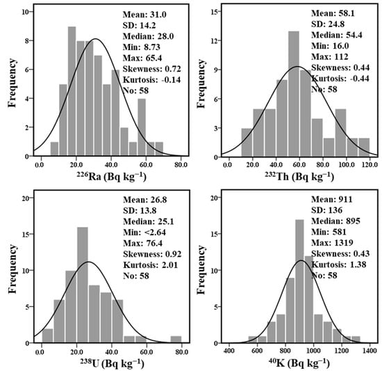 According to the spatial distribution of 226Ra, 232Th, 238U, and 40K radionuclides (Figure 2), the highest activity concentrations of these radionuclides were as follows: 65.4 Bq kg−1 at site H4 in the HR watershed, 112 Bq kg−1 at site N5 in the NR watershed, 76.4 Bq kg−1 at site S3 in the SR watershed, and 1319 Bq kg−1 at site H9 in the HR watershed. In contrast, the lowest activity concentrations of these radionuclides were recorded as follows: 8.73 Bq kg−1 at site H3 in the HR watershed, 16.0 Bq kg−1 at site N10 in the NR watershed, below the minimum detectable activity at sites N14 and N16 in the NR watershed, and 581 Bq kg−1 at site Y3 in the YR watershed. Based on the calculated skewness (226Ra, 0.72; 232Th, 0.44; 238U, 0.92; 40K, 0.43) and kurtosis (226Ra, −0.14; 232Th, −0.44; 238U, 2.01; 40K, 1.38) values, the activity concentrations of these radionuclides generally showed an asymmetric and peaked distribution, but with a high-frequency distribution centered around the mean value (Figure 3).